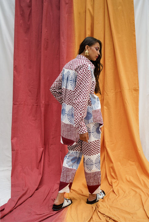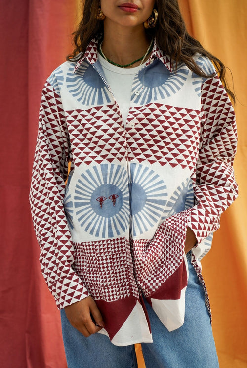 An eclectic shirt, hand block printed with a cool play of geometric motifs, it features an asymmetrical hemline, for maximum room and comfort.
