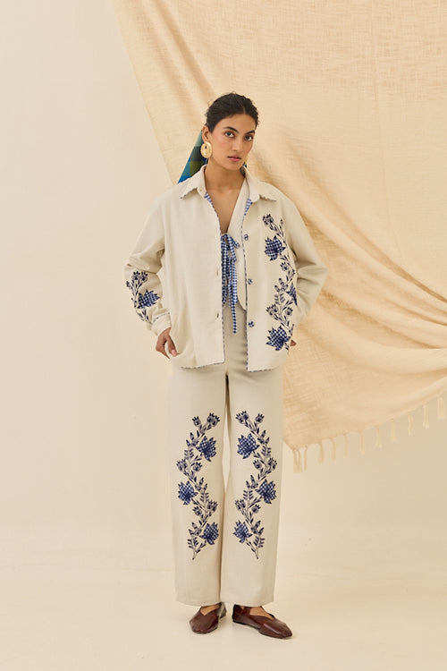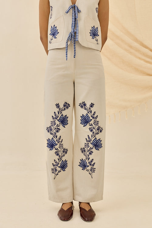 Stylish banana fit trousers made from structured handwoven white denim. The minimalist silhouette is dramatically detailed with heavy, intricate navy blue gingham check floral running down the front of the legs, transforming a classic trouser into a wearable art piece.